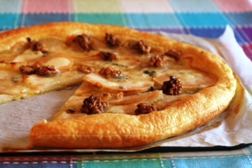 2. Taking care to avoid the margin you’ve just created, arrange the pear slices in one layer on top of the pastry. At this point the tart looks very mean and you’ll be tempted to add more pear slices. Hold your nerve. The tart will be soggy if you overdo the fruit. Distribute the pieces of cheese evenly over the surface of the tart, followed by the walnut halves. Dot the pieces of pear with the salted butter. Place in the pre-heated oven and bake for 12 – 15 minutes until the pastry is golden and cooked through and the cheese melted. Serve hot or warm.